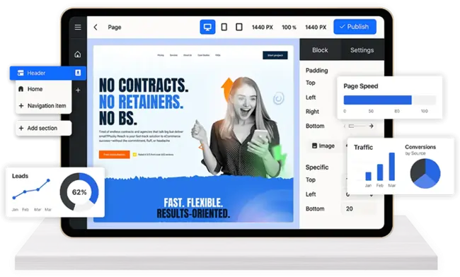 Make your success path easier with our affordable and easy website builder. By bridging the gap between creativity and technical execution, we help you push the boundaries of success with our pre-made templates and achieve outstanding results in both aesthetics and functionality.