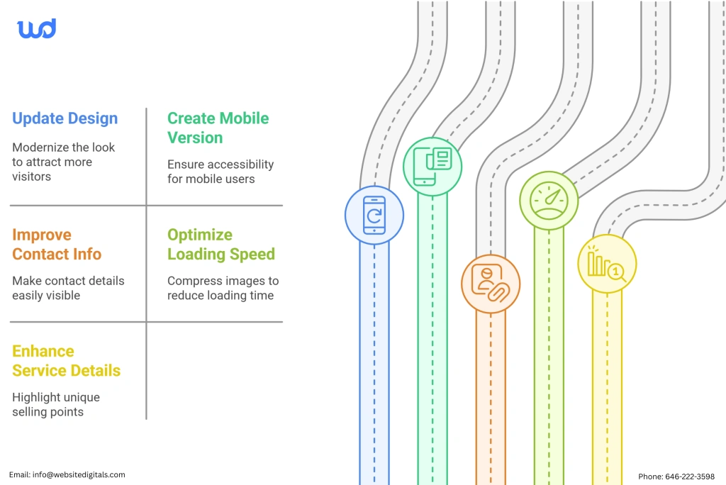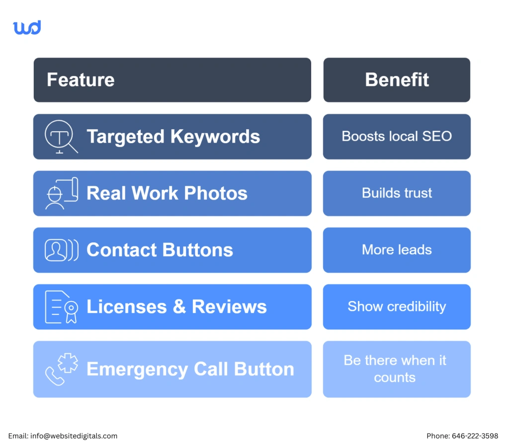 Aim for a design that’s both attractive and easy to navigate with Website Digitals today! Contact us at (646) 222-3598 or email info@websitedigitals.com. Also, make sure your site is optimized for local search, emphasizing your service areas and technical expertise.