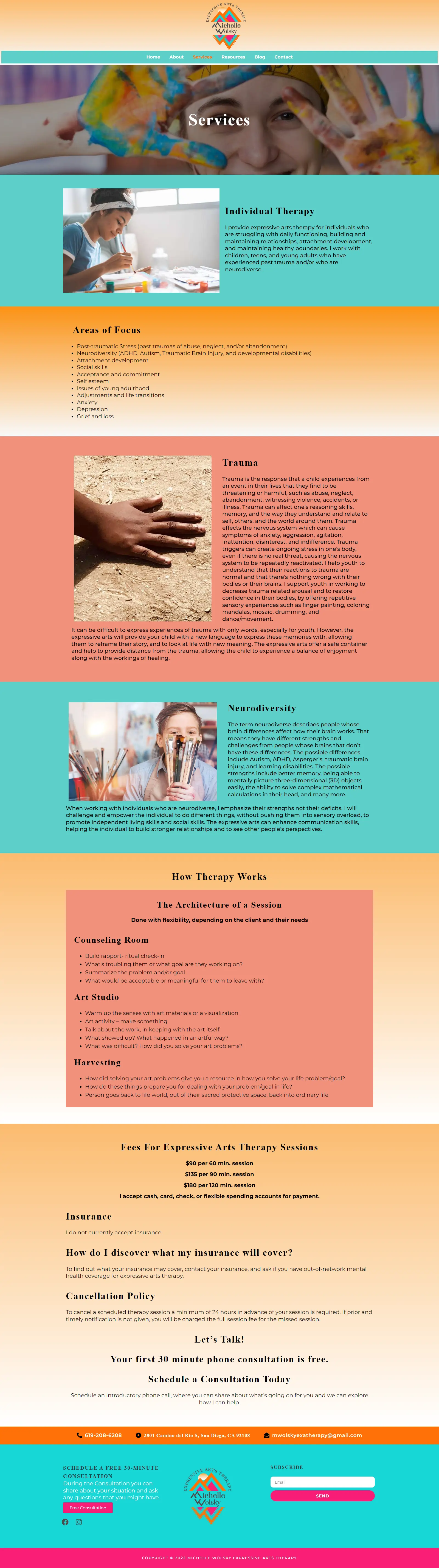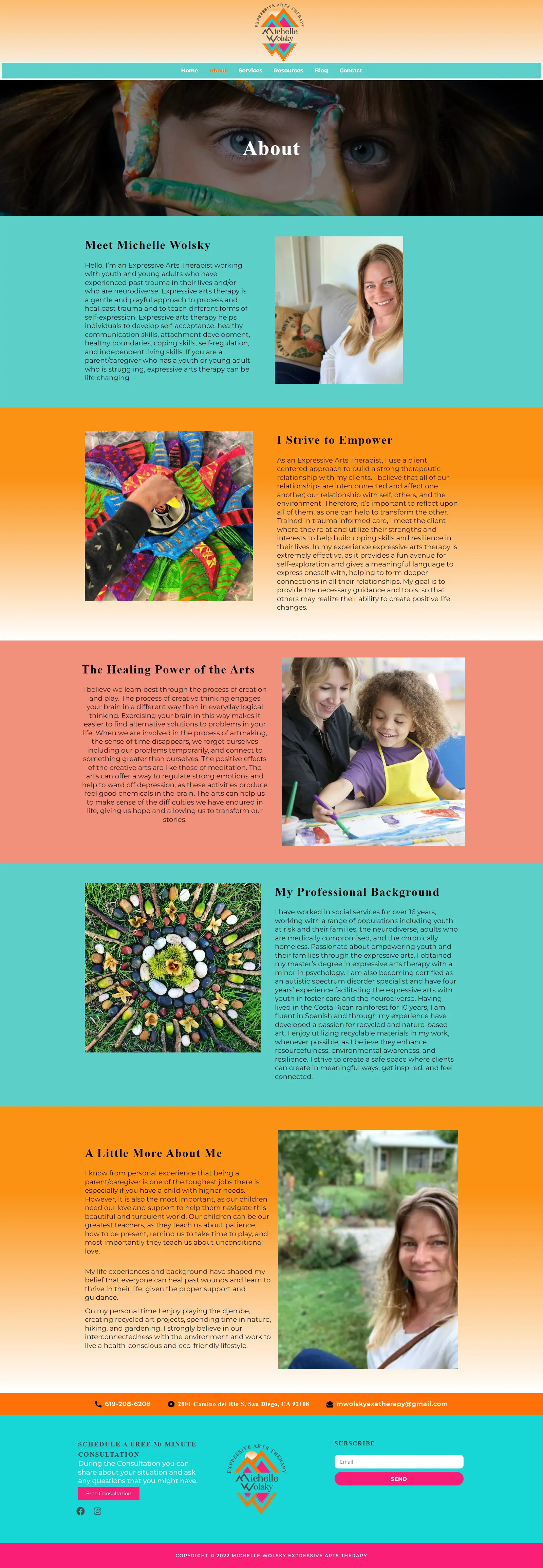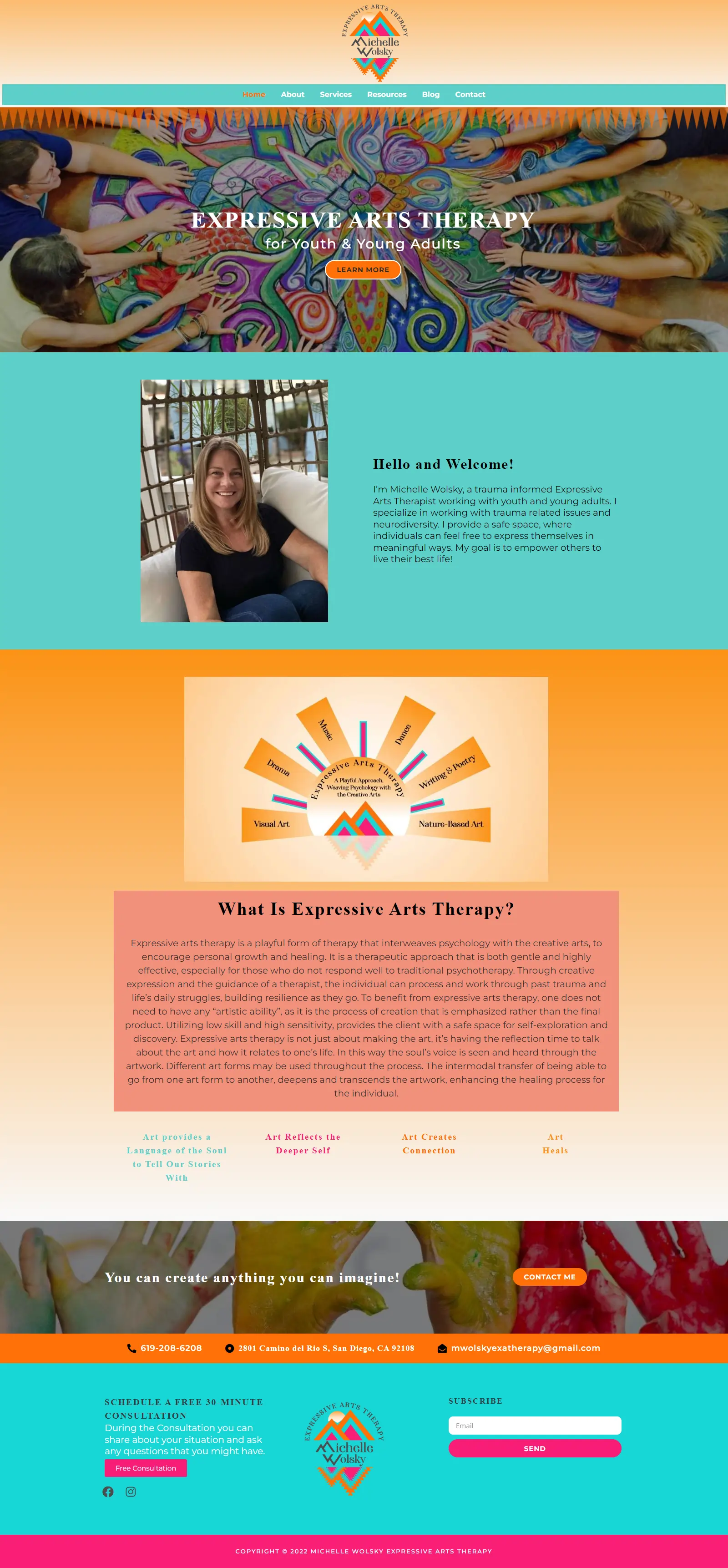 A vibrant creative therapy portal dedicated to healing through artistic expression. Michelle Wolski Creative Therapy provides resources, workshops, and support for those exploring art as a form of therapy. The website’s colorful and engaging layout makes it easy for users to find inspiration and connect with therapeutic art practices.